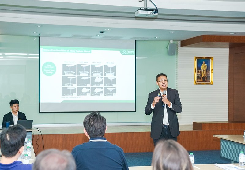 Finally, Mr. Danai Thanit, President of Poonphol Group, expresses his gratitude to the UTCC delegation for visiting SMS Corporation. He emphasizes the importance of sharing knowledge, empowering young generations, and fostering innovation as core values for a sustainable industry.