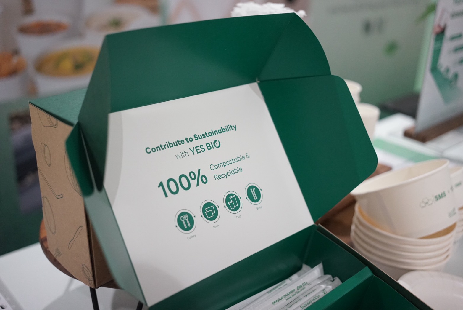 Meanwhile, YES BIO showcases its compostable food packaging solutions, highlighting the brand’s commitment to environmentally responsible alternatives for food and beverage sectors.
