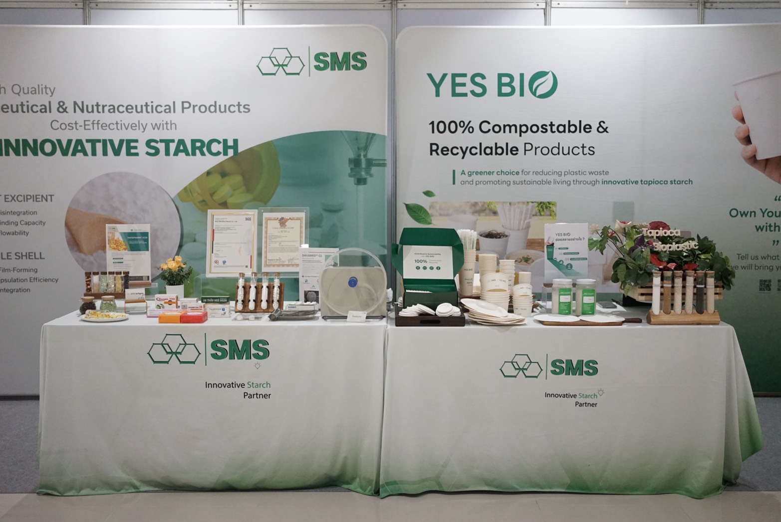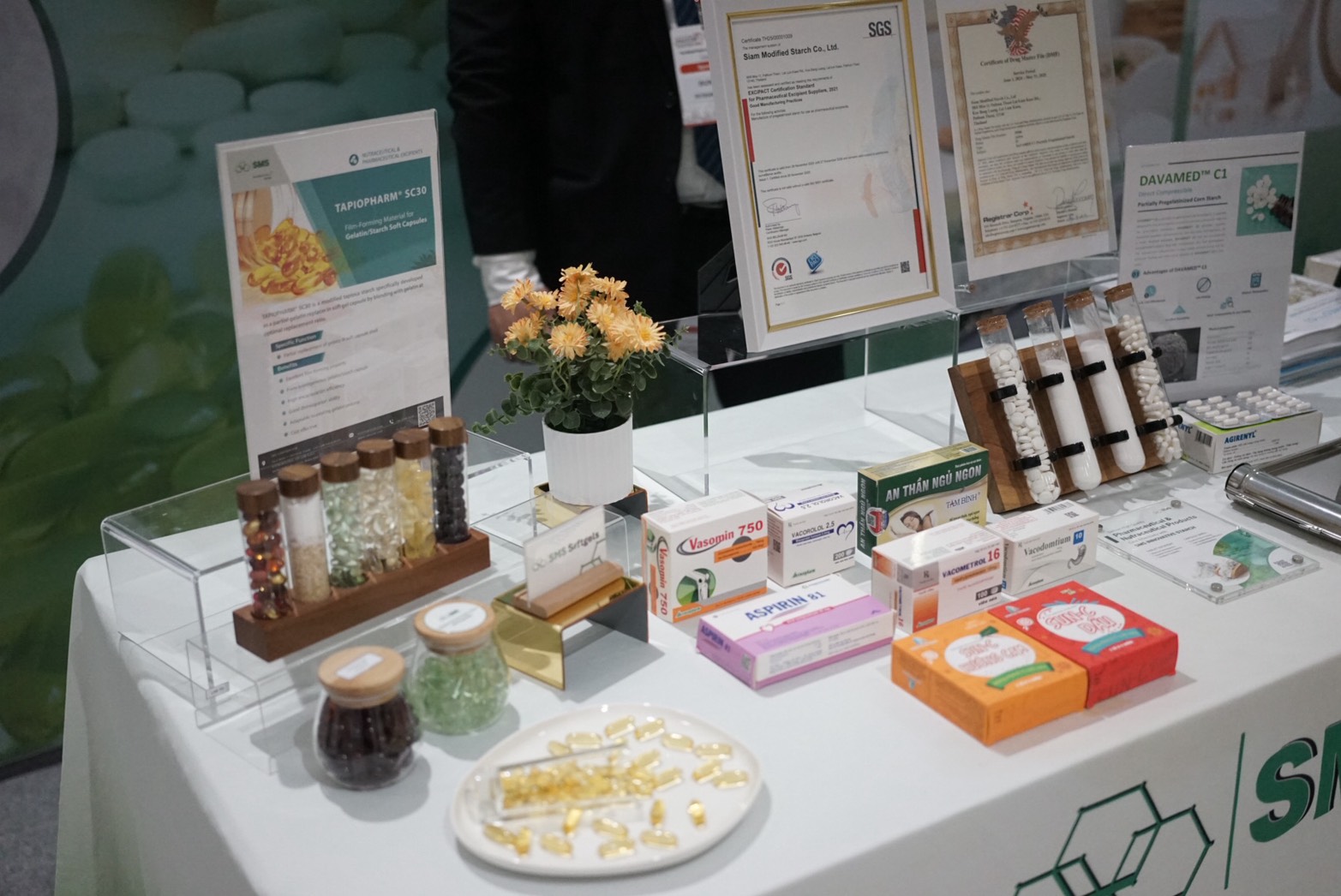 At the event, SMS presented its pharmaceutical- and nutraceutical-grade modified tapioca starch solutions, including the DAVAMED series–certified under EXCiPACT and TAPIOPARM series. These products are developed to meet stringent pharmaceutical standards and are designed to support high-performance drug formulation applications.
